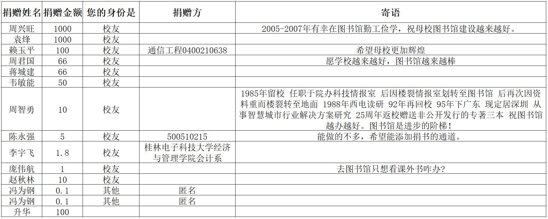 截止2021年3月14日,我为图书馆增建设捐赠项目共计收到2410.00元爱心捐赠(该汇总为桂电人平台导出数据数据汇总)。现将该项目明细公示如下:
