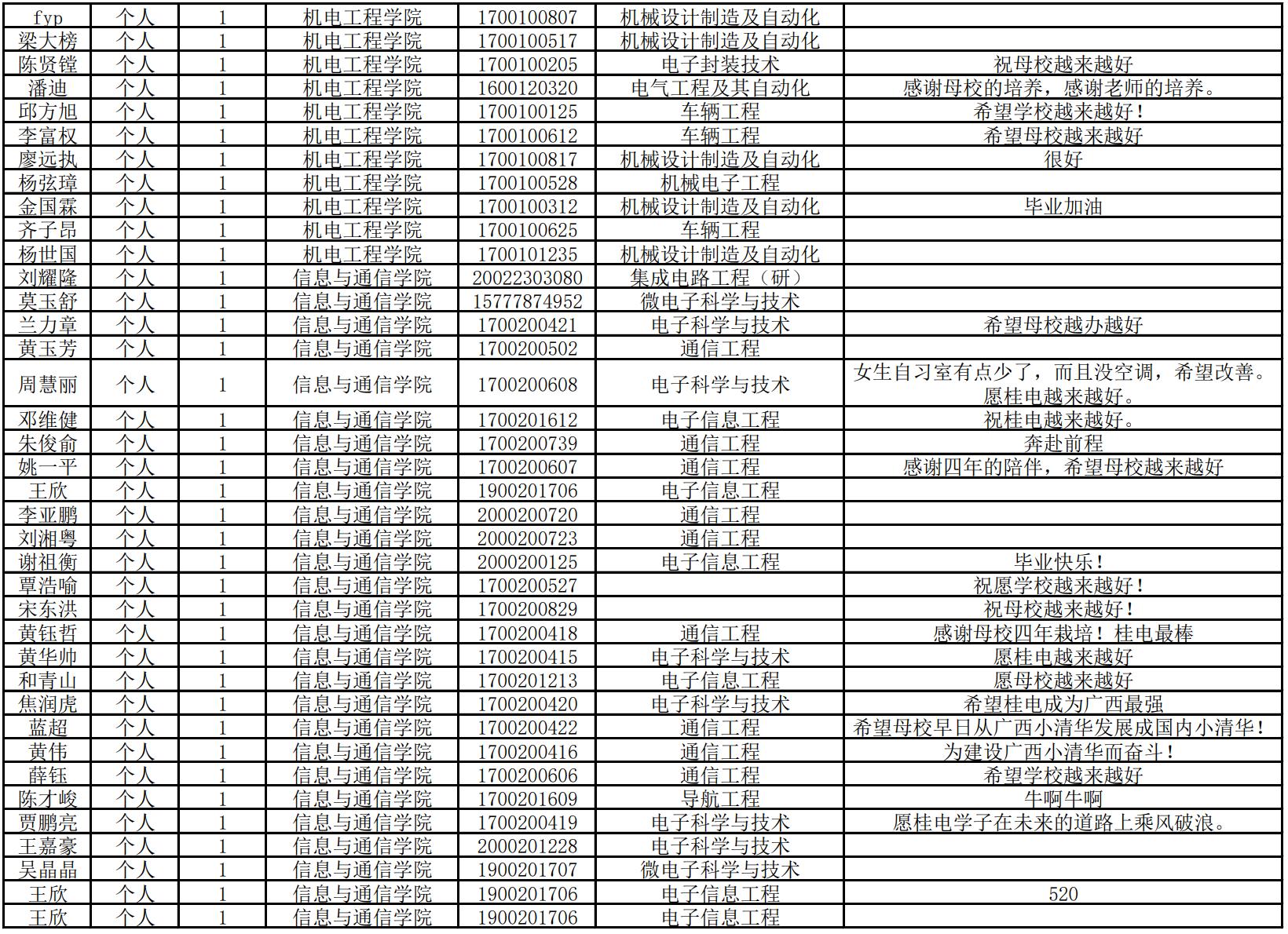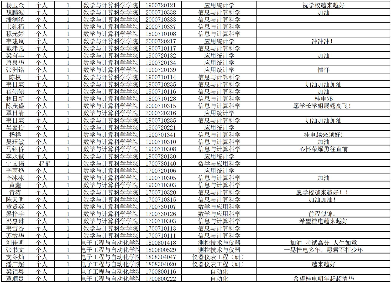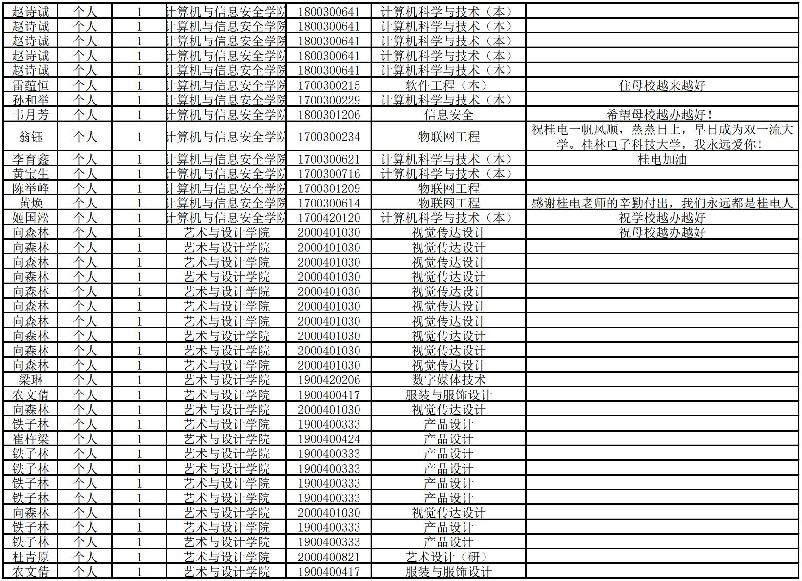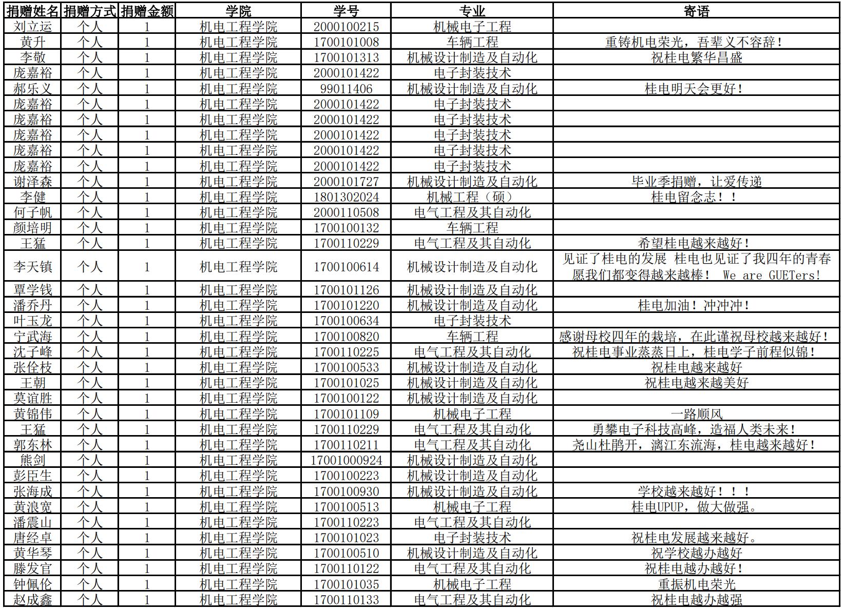 2021年1月1日-11月10日,桂电发展,有你有我——毕业季1元捐项目共计收到1295元爱心捐赠(该汇总为桂电人平台导出数据数据汇总)。现将该项目明细公示如下: