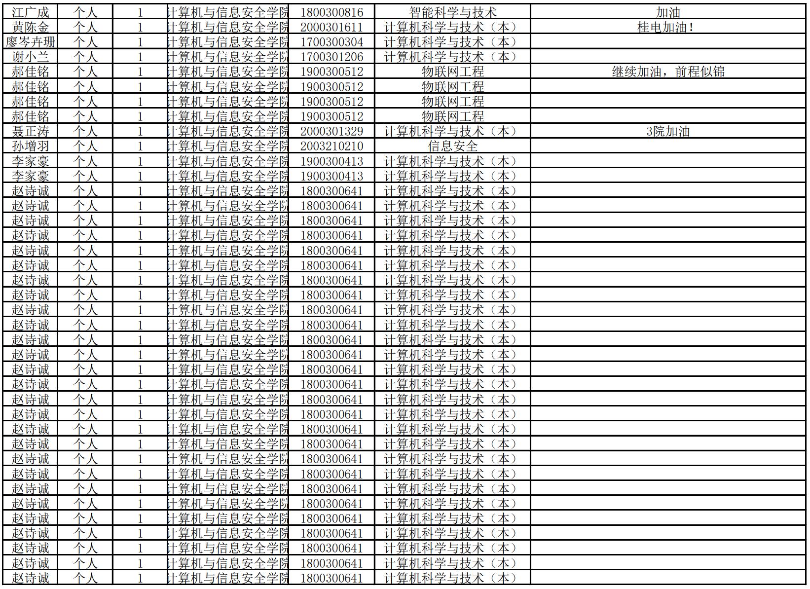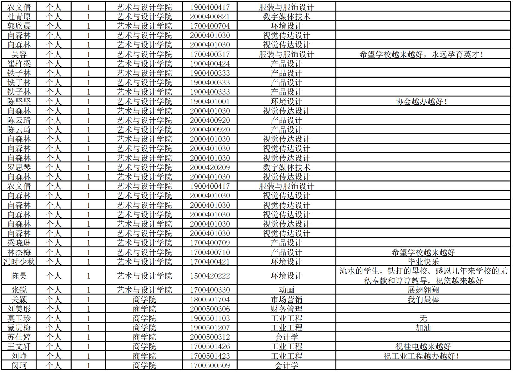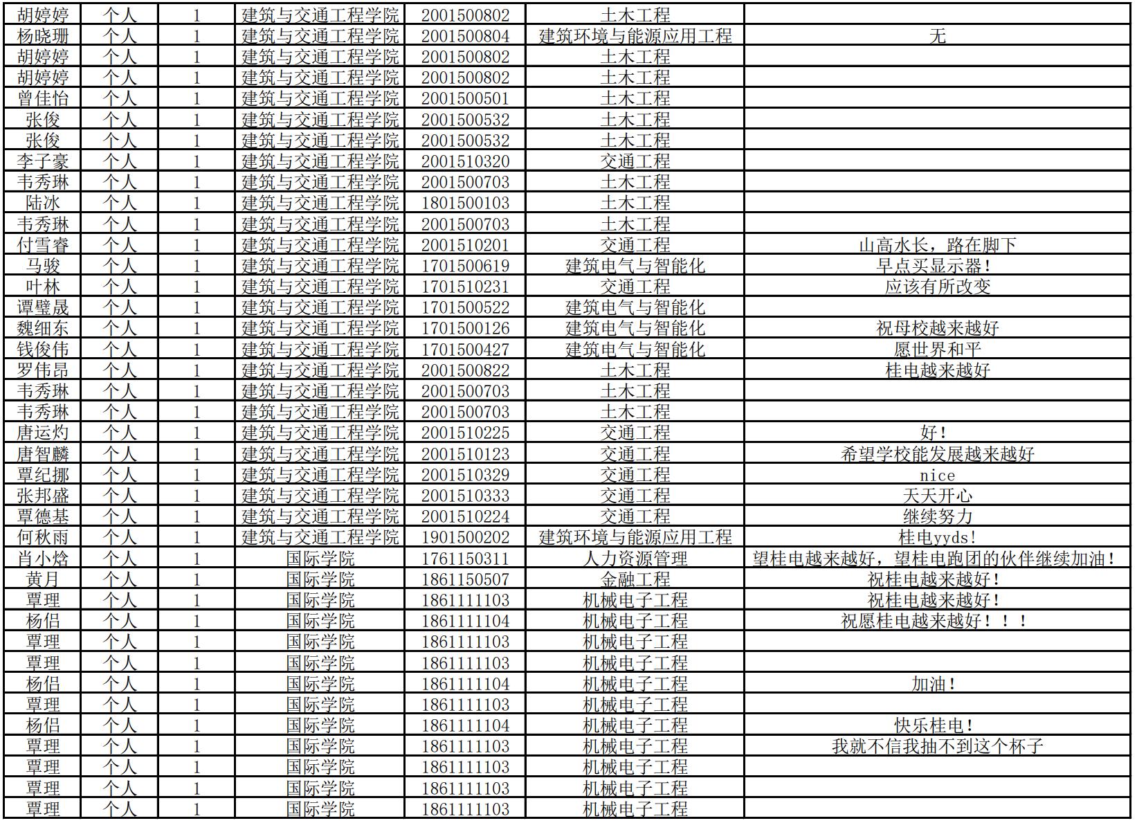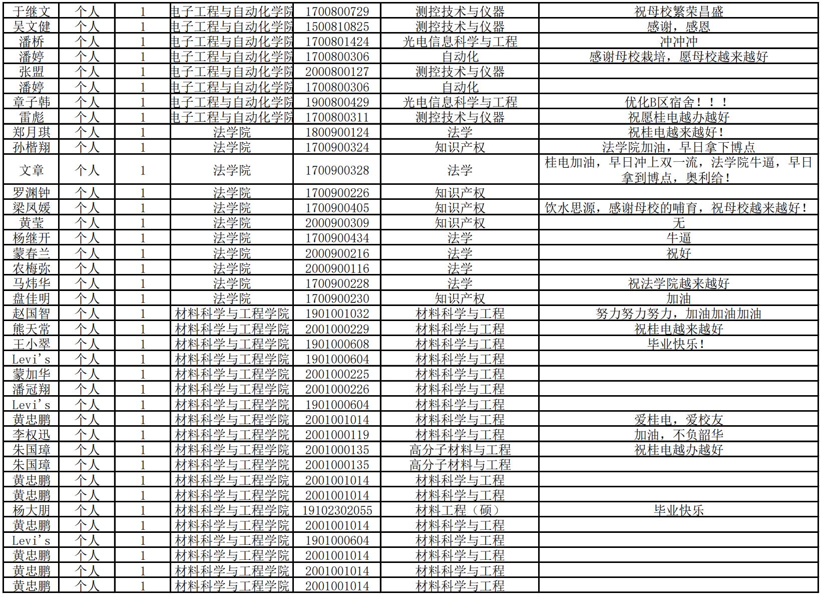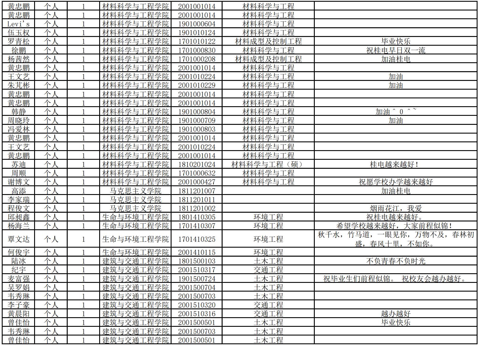 2021年1月1日-11月10日,桂电发展,有你有我——毕业季1元捐项目共计收到1295元爱心捐赠(该汇总为桂电人平台导出数据数据汇总)。现将该项目明细公示如下: