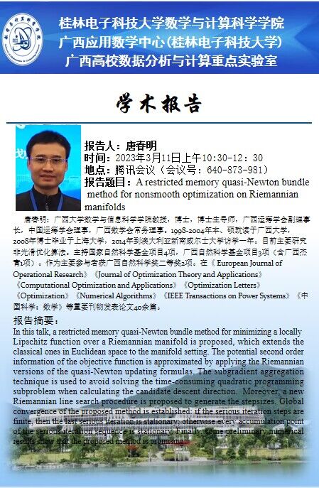 唐春明:广西大学数学与信息科学学院教授,博士,博士生导师,广西运筹学会副理事长,中国运筹学会理事,广西微学会常务理事。1998-2004年本、 硕就读于广西大学,2008年博士毕业于上海大学,2014年到澳大利亚新南威尔士大学访学一年。目前主要研究非光滑优化算法。主持国家自然科学基金项目4项,广西自然科学基金项目3项(含广西杰青项》。作为主要参与者获广西自然科学奖二等奖2项。在《European Journal ofOperational Research》《Journal of Optimization Theory and Applications》(Computational Optimization and Applications》(Optimization Letters)(Optimization》《Numerical Algorithms》(IEEE Transactions on Power Systems》《中国科学:教学》等置要刊物发表论文40余篇。