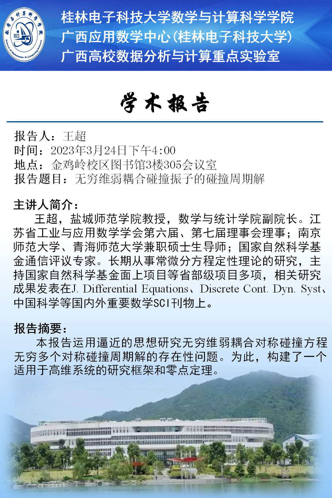 应数学与计算科学学院、广西应用数学中心(桂林电子科技大学)及广西高校数据分析与计算重点实验室邀请,盐城师范学院王超教授和北京理工大学王林教授将于2023年3月24日来校讲学,欢迎全校师生踊跃参加。报告具体安排如下:
