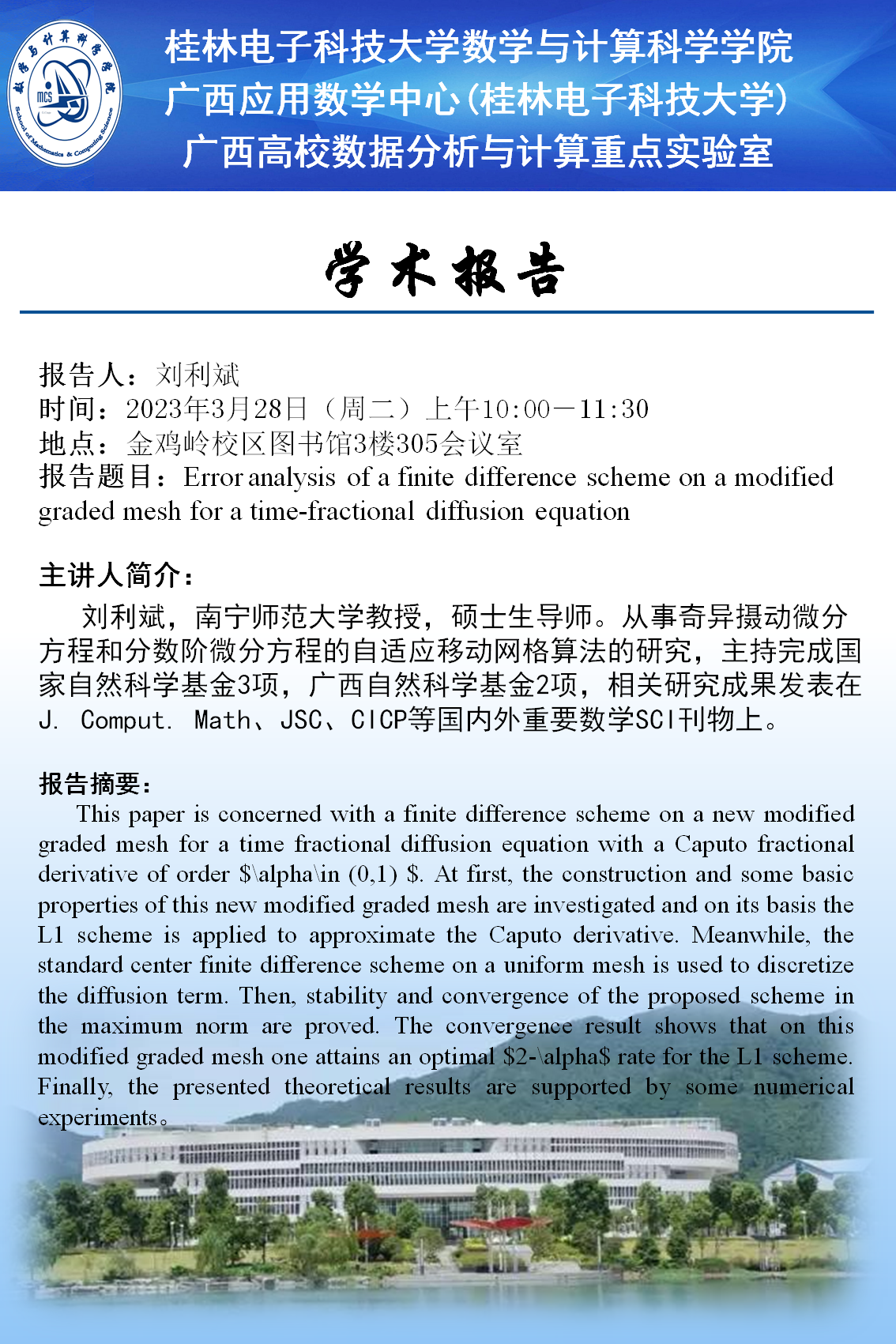 应数学与计算科学学院、广西应用数学中心(桂林电子科技大学)及广西高校数据分析与计算重点实验室邀请,南宁师范大学刘利斌教授将于2023年3月28日来校讲学,欢迎全校师生踊跃参加。报告具体安排如下: