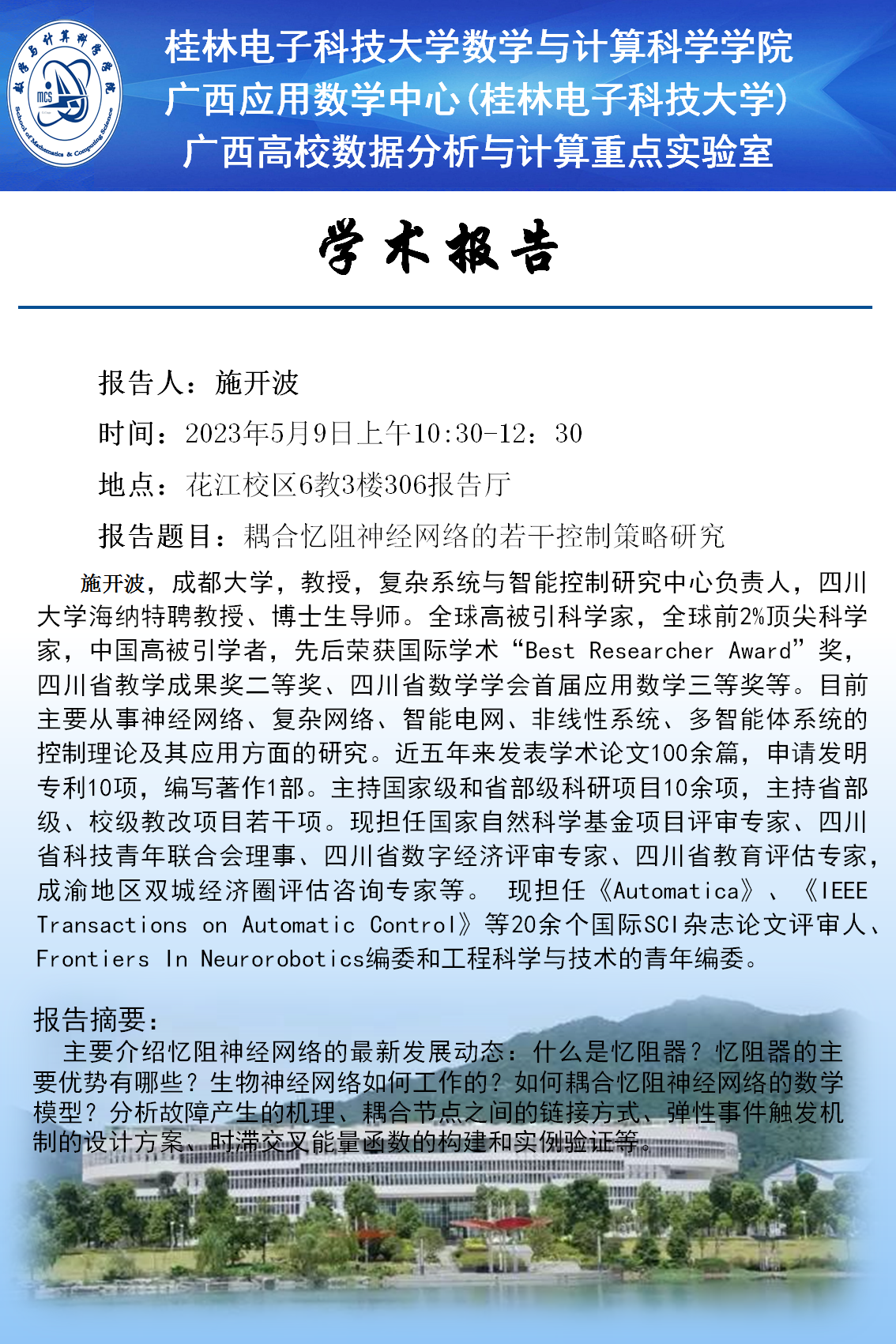 应数学与计算科学学院、广西应用数学中心(桂林电子科技大学)及广西高校数据分析与计算重点实验室邀请,成都大学施开波教授将于2023年5月9日来校讲学,欢迎全校师生踊跃参加。报告具体安排如下: