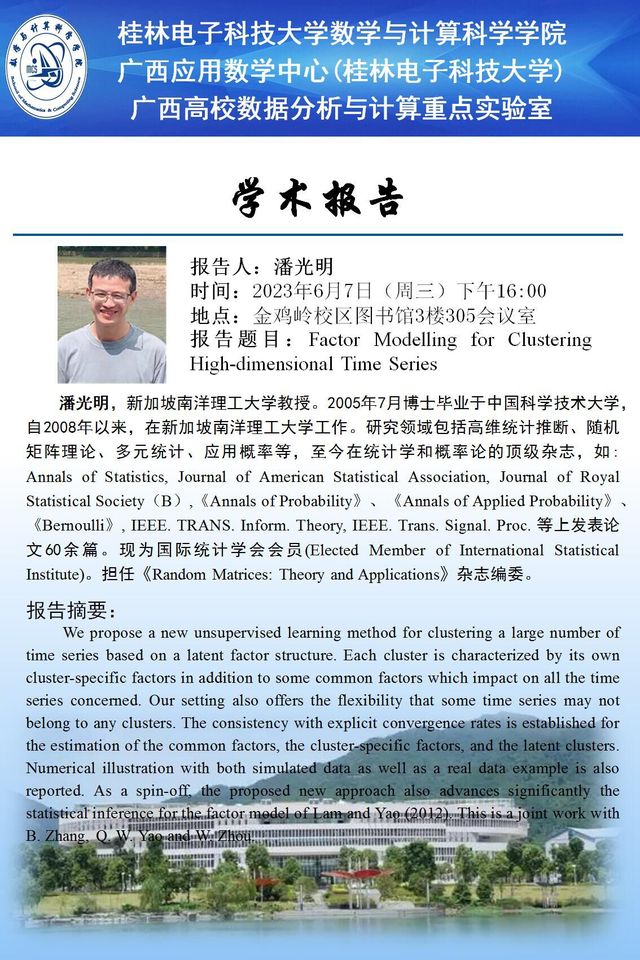 应数学与计算科学学院、广西应用数学中心(桂林电子科技大学)及广西高校数据分析与计算重点实验室邀请,新加坡南洋理工大学潘光明教授将于2023年6月7日来校讲学,欢迎全校师生踊跃参加。报告具体安排如下: