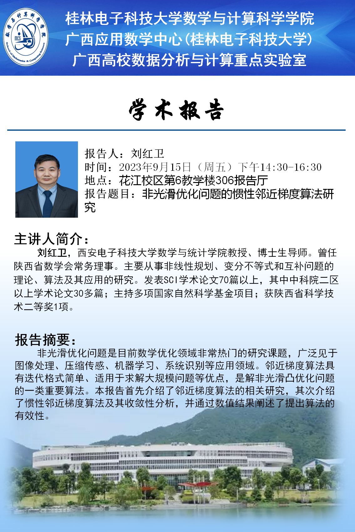 应数学与计算科学学院、广西应用数学中心(桂林电子科技大学)及广西高校数据分析与计算重点实验室邀请,西安电子科技大学刘红卫教授将于2023年9月15日来校讲学,欢迎全校师生踊跃参加。报告具体安排如下: