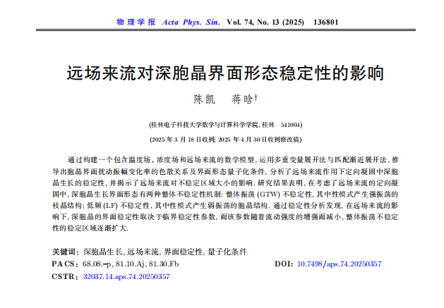 2023级硕士研究生陈凯以第一作者身份在学术期刊 “《物理学报》(Acta Physica Sinica)” 发表了题为 “远场来流对深胞晶界面形态稳定性的影响” 的研究论文,其导师蒋晗(高级工程师)为通讯作者。