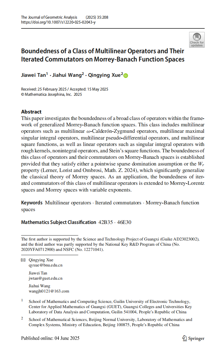 谭嘉伟老师以第一作者身份在国际学术期刊 “Journal of Geometric Analysis” 发表了题为 “Boundedness of a Class of Multilinear Operators and Their