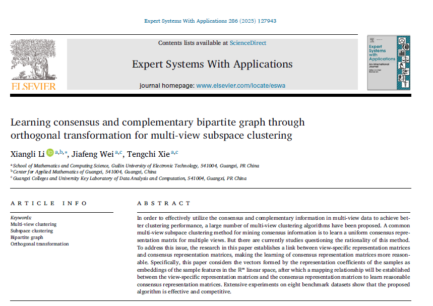 2023级硕士研究生韦嘉逢以第二作者身份在国际学术期刊 “Expert Systems With Applications” 发表了题为 “Learning consensus and complementary bipartite graph throughorthogonal transformation for multi-view subspace clustering” 的研究论文。其导师李向利教授为第一作者。