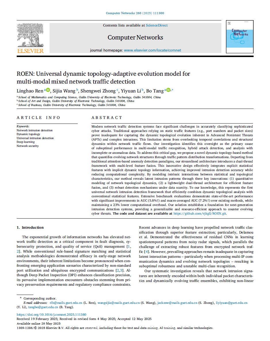 2023级本科生任凌颢以第一作者身份在国际学术期刊 《Computer Networks》发表了题为 “ROEN: Universal Dynamic Topology-Adaptive Evolution Model for Multi-modal Mixed Network Traffic Detection” 的研究论文。其指导老师唐波副教授为通讯作者。