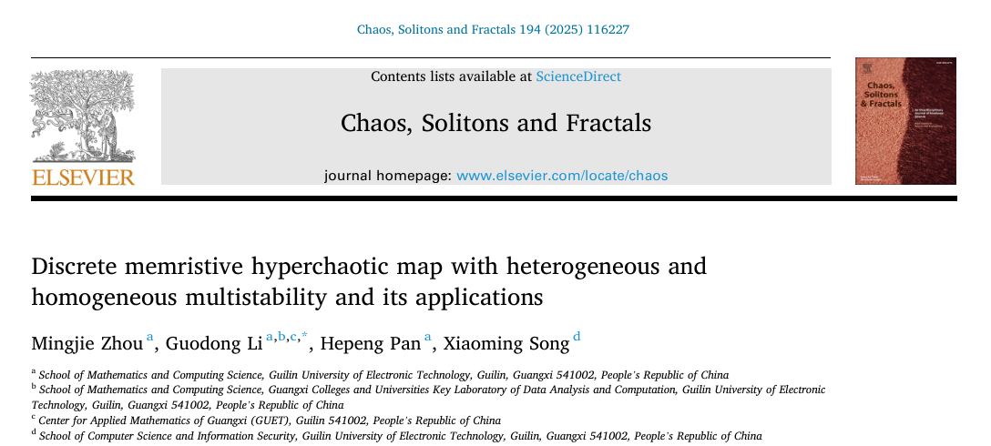 2023级硕士研究生周明杰以第一作者在中科院一区TOP期刊CHAOS SOLITONS & FRACTALS发表了题为“Discrete memristive hyperchaotic map with heterogeneous and homogeneous multistability and its applications”的研究论文,其导师李国东教授为通讯作者。该研究工作得到李国东广西省自然科学基金资助,李国东桂林电子科技大学基金资助,张敬旭GUET研究生教育创新项目资助,自治区高校数据分析与计算重点实验室和广西应用数学中心(GUET)资助。