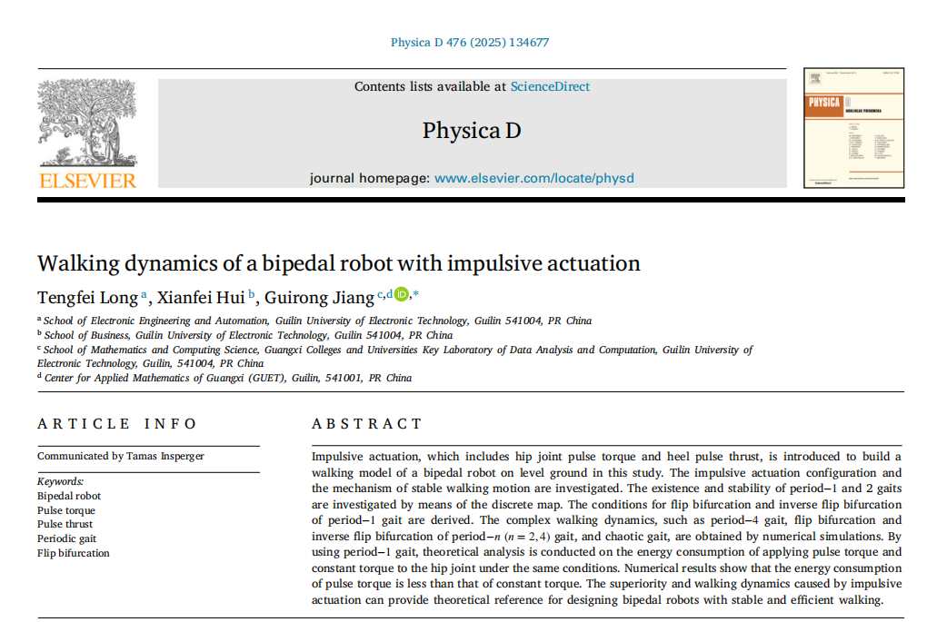 电子工程与自动化学院2022级博士研究生龙腾飞以第一作者在Physica D: Nonlinear Phenomena》发表题为“Walking dynamics of a bipedal robot with impulsive actuation”的研究论文。数学与计算科学学院蒋贵荣教授为论文的通讯作者。