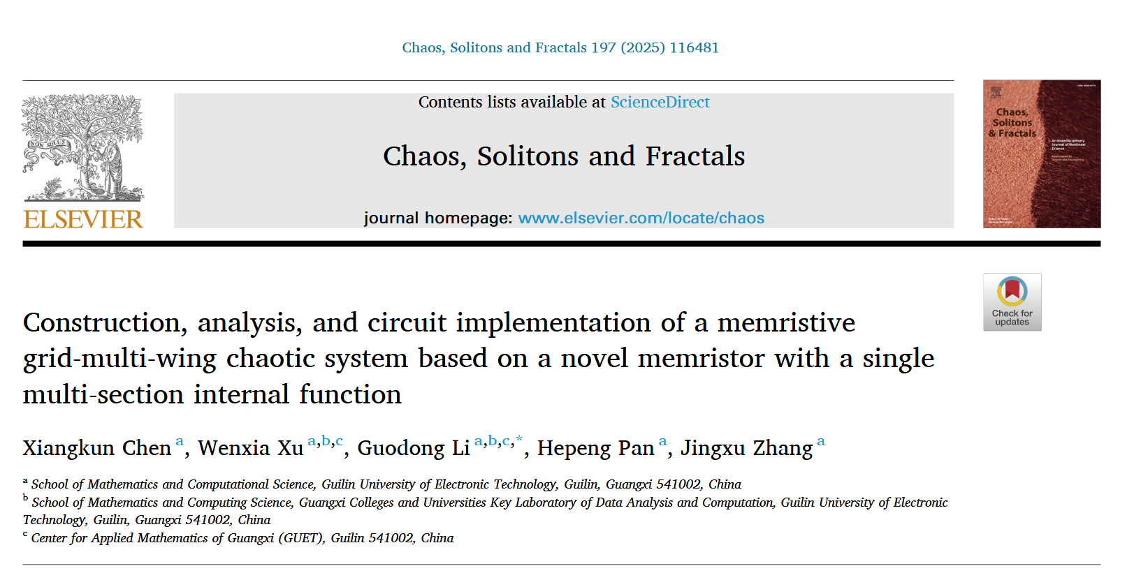 2023级硕士研究生陈相坤以第一作者身份在国际学术期刊Chaos, Solitons & Fractals在线发表了题为“Construction, analysis, and circuit implementation of a memristive grid-multi-wing chaotic system based on a novel memristor with a single multi-section internal function”的研究论文,其导师李国东教授为通讯作者。该研究工作得到了广西壮族自治区自然科学基金、广西壮族自治区科技计划项目、广西壮族自治区高校数据分析与计算重点实验室创新项目和广西应用数学研究中心 (桂林电子科技大学) 的资助。