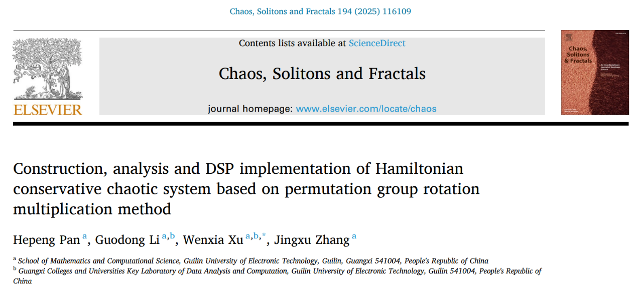 2022级硕士研究生潘河朋以第一作者身份在国际学术期刊Chaos, Solitons and Fractals在线发表了题为“Construction, analysis and DSP implementation of Hamiltonian conservative chaotic system based on permutation group rotation multiplication method”的研究论文,其导师李国东教授为第二作者。该研究工作得到李国东广西自然科学基金资助,李国东广西科技基地和人才专项基金资助,潘河朋GUET研究生教育创新项目资助,张敬旭广西研究生教育创新项目资助,自治区高校数据分析与计算重点实验室和广西应用数学中心(GUET)资助。