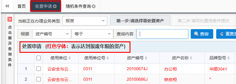 答:处置申请中,在“处置申请”里查询名下拟报废的资产时,资产信息为红色字体的表示达到报废年限。若不显示某条资产信息,其原因是该资产处在调剂、变更资产使用人等业务状态中,需要取消或者结束正在办理的业务,才能申请报废。
