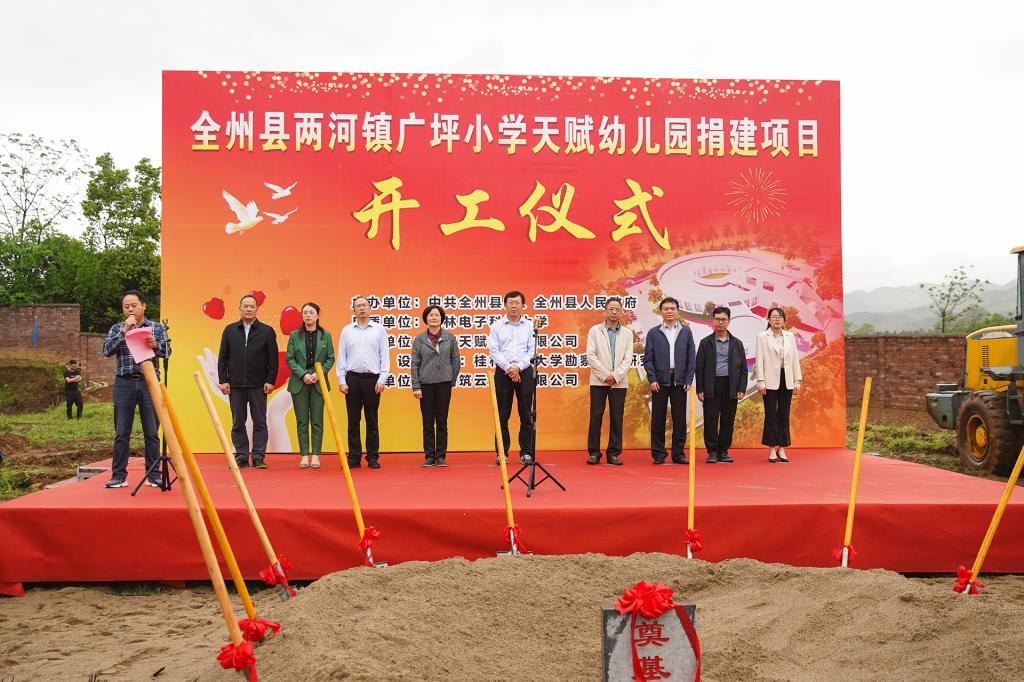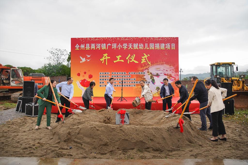 校党委副书记陈贵英、全州县委副书记伍茂民分别在仪式上致辞。陈贵英指出,自2021年我校乡村振兴帮扶地确定为全州县以来,全体师生弘扬脱贫攻坚精神,多渠道为全州县巩固拓展脱贫攻坚成果和全面推进乡村振兴工作做贡献。经学校牵线搭桥,引入爱心企业南京天赋控股有限公司,捐资建设天赋幼儿园项目,着力完善两河镇的基础教育设施,解决农村留守幼儿入园难、入园远的问题。学校将一如既往地全力支持项目推进,期盼参建各方继续齐心协力、精心组织、科学施工,争取项目早日竣工,服务好全州父老乡亲。伍茂民代表全州县委、县人民政府对这次活动的举办表示热烈的祝贺,向我校和南京天赋控股有限公司表示衷心的感谢。他指出,天赋幼儿园项目建设意义重大,可以极大地改变周边6个村委的幼儿园教学条件,帮助孩子们获得更好的教育资源。我们将保质保量圆满完成建设任务,为孩子们的成长提供更加好的条件和资源。